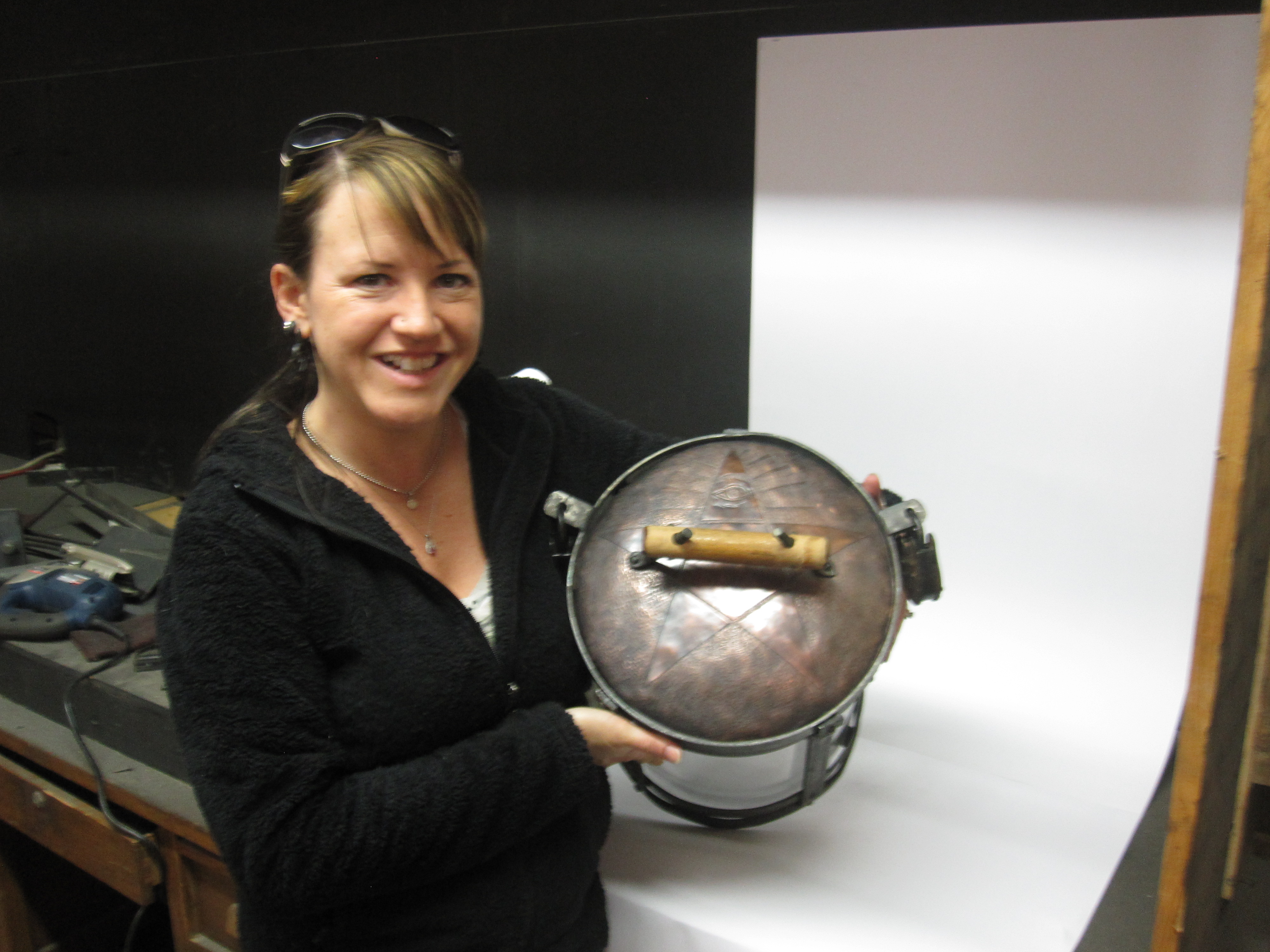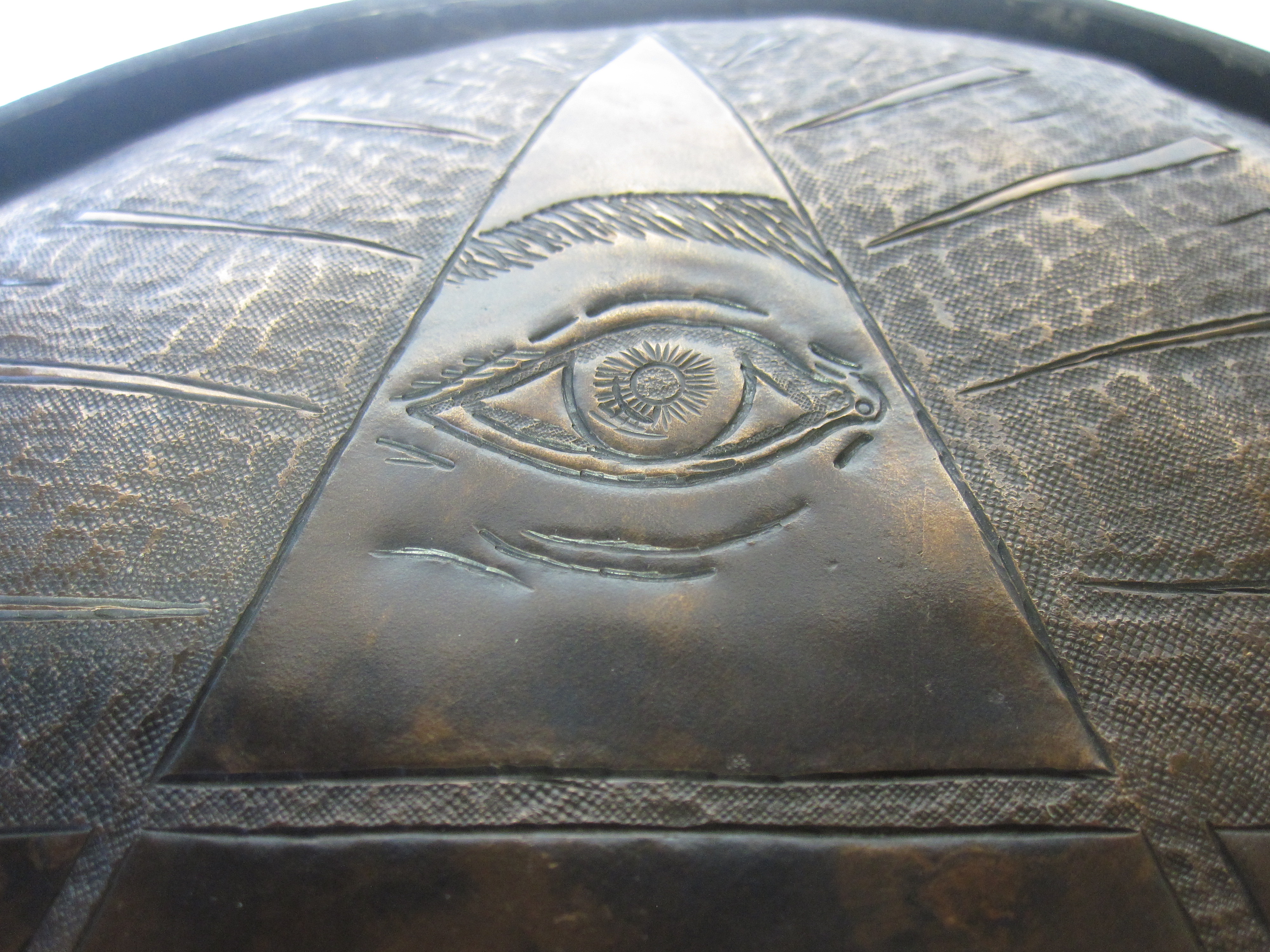 In March 2013 I had the privilege to co-create a piece with my good friend and blacksmith Theron Ross for the TV Series “Sleepy Hollow” that was filmed near Charlotte, NC. This is the “jar” the headless horseman’s head was buried in on the series. Theron created the Iron frame and I made the domed copper top with the All Seeing Eye and star emblem chased into the surface.